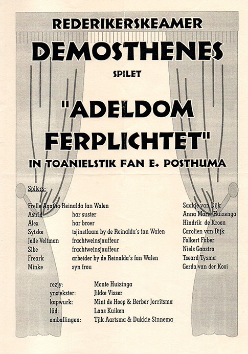 Twa susters en in broer, allegearre al sawat om ende by de 60 jier, binne fan adelik komôf, hawwe in grut part fan it eardere famyljebesit al ferkeapje moatten en wenje no noch yn in kreaze bungalow mei in feint foar de hynders en de tún en in faam foar it wurk. De âldste fan de froulju sjocht de wrâld noch as yn de tiid fan de adel: hege hearen en dames en dêrnjonken earme arbeiders, dy’t dat hege folk tige achtenearje. De jongste tinkt dêr oars oer, en hat wol troch dat it gewoane folk oars tinkt as hûndert jier tebek. De man hat lykas syn heit altyd rij libbe: der hynders op nei hâlde, dêrmei nei draverijen, gokke en sûpe en samar troch. Sa dwaande is it besit aardich beklonken en is dat gjin rêgegraat mear foar de staasje sa’t hja dy winliken wol fiere wolle. De man hat koartlyn in manspersoan oanriden en is mei in stik yn ‘e kraach trochriden. De ûntjouwing yn dit stik slacht op it feit, dat hja troch in tafal út ‘e mûle fan ien dy’t it witte kin, komme te hearren hoe’t it folk destiids – en no foaral – oer harren tinkt (it earste tema) èn dat oan ‘e ein fan it stik bliken docht foar de susters dat harren broer immen deariden hat en dat stilhâlden hat (twadde tema). Hy wurdt yn ’t lêst fan it tredde bedriuw foar de kar set oft hysels de plysje skilje sil of dat hja it dwaan moat. Hy nimt de telefoan en dan giet it doek ticht.